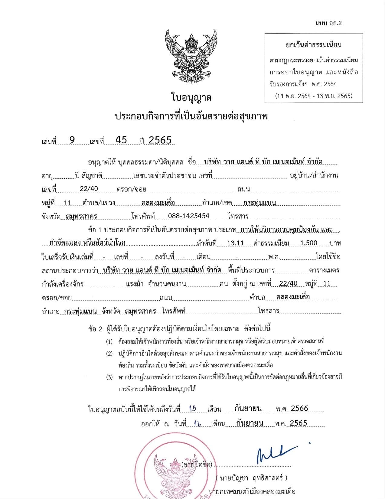 บริษัท วาย แอนด์ ที บัก เมเนจเม้นท์ จำกัด ดำเนินธุกิจด้านบริการควบคุมและกำจัดสัตว์พาหะแบบครบวงจร